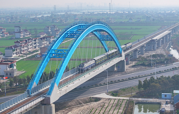 This photo taken on March 13, 2024 shows a test train running on the Yangkou Port-Lyusi Port Railway in Haimen District, Nantong City, Jiangsu Province. (CFP Photo)