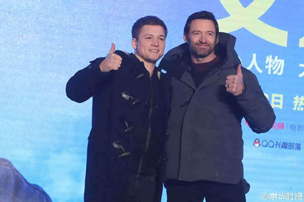 Hugh Jackman and his co-star Taron Egerton have come to Beijing to promote their new film " Eddie the Eagle " .[Detail]