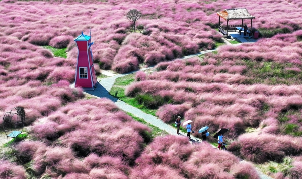 Parks across Jiangsu are bursting with spectacular autumn scenery, drawing locals and tourists alike to enjoy the vibrant colors. Flowers including purple-pink muhly grass, sunflowers and chrysanthemums paint the landscape in nature's brightest hues.