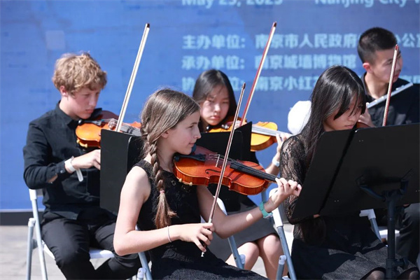 In Nanjing, more than 70 Chinese and foreign students from Nanjing International School, Nanjing Little Red Flower Art Troupe, and the Institute of International Education at Nanjing University of the Arts played music near the ancient city wall.