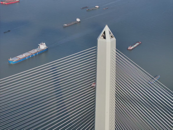 The bridge’s main channel features a record-setting central cable-stayed span, while its two auxiliary channel bridges include the longest steel arch span. The steel deck paving covers more than 250,000 square meters, equivalent to about 33 football pitches.